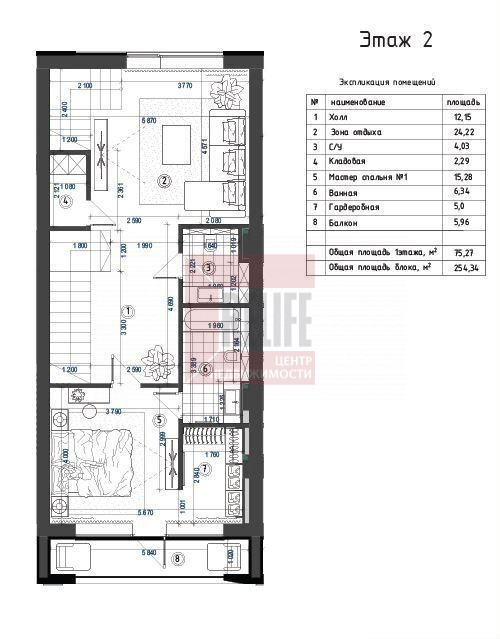 2 этаж: зона отдыха 24.22 кв.м., мастер спальня 15.28 кв.м с гардеробной, собственной ванной комнатой и выходом на просторный балкон.