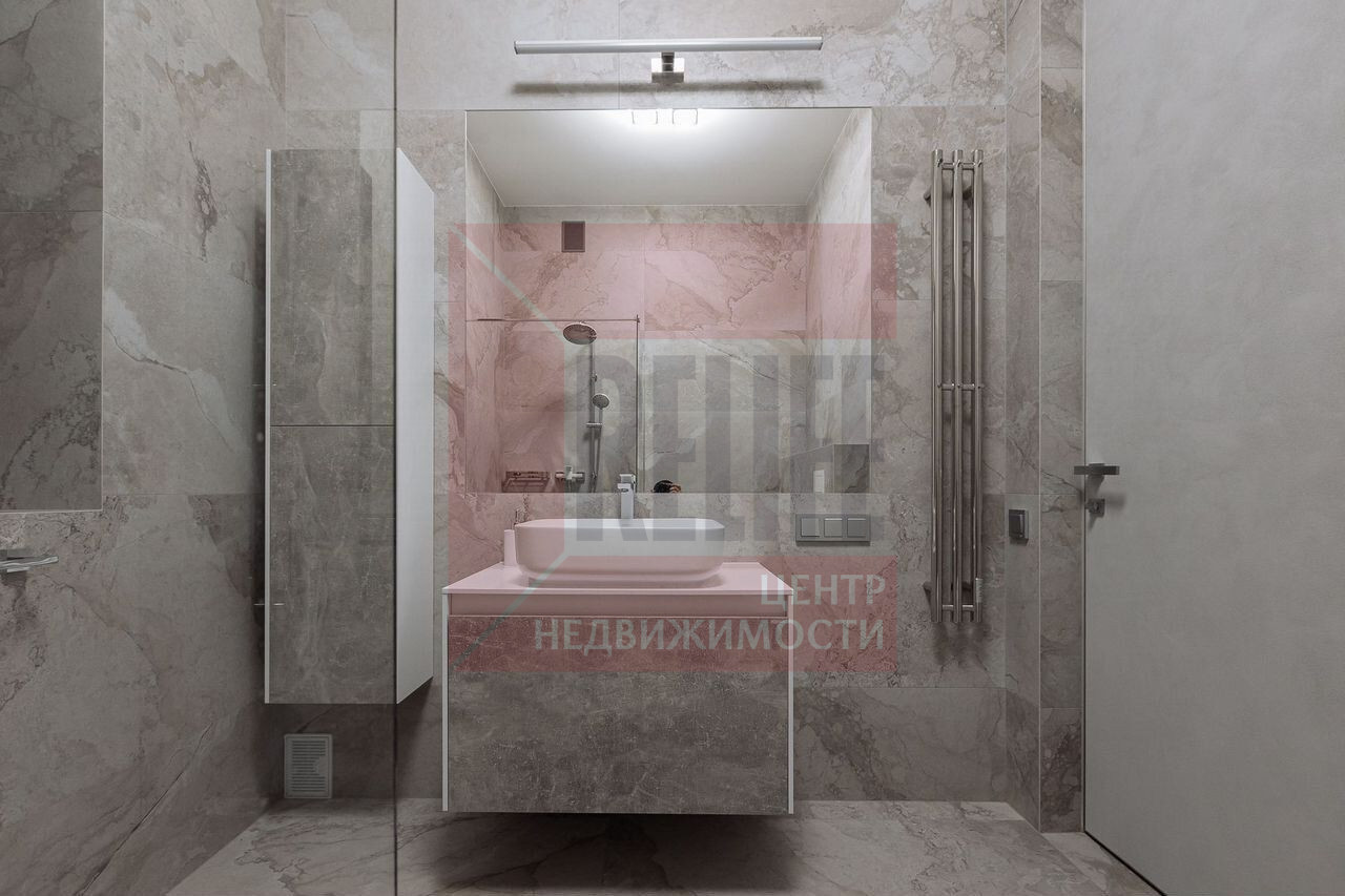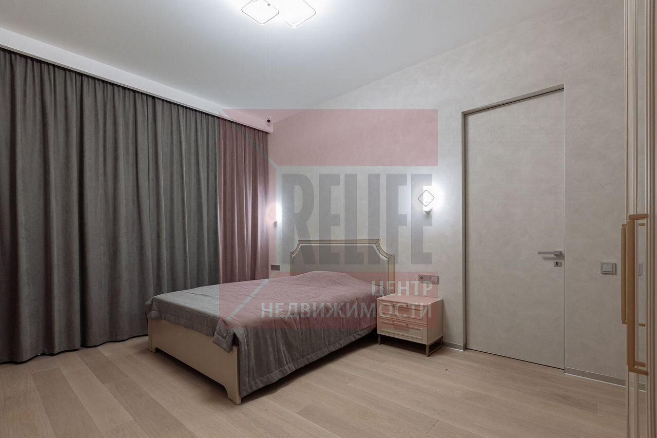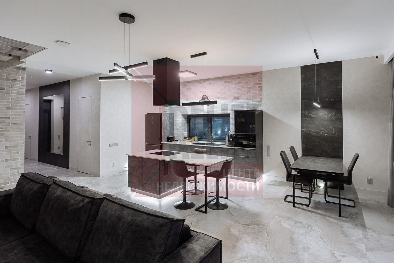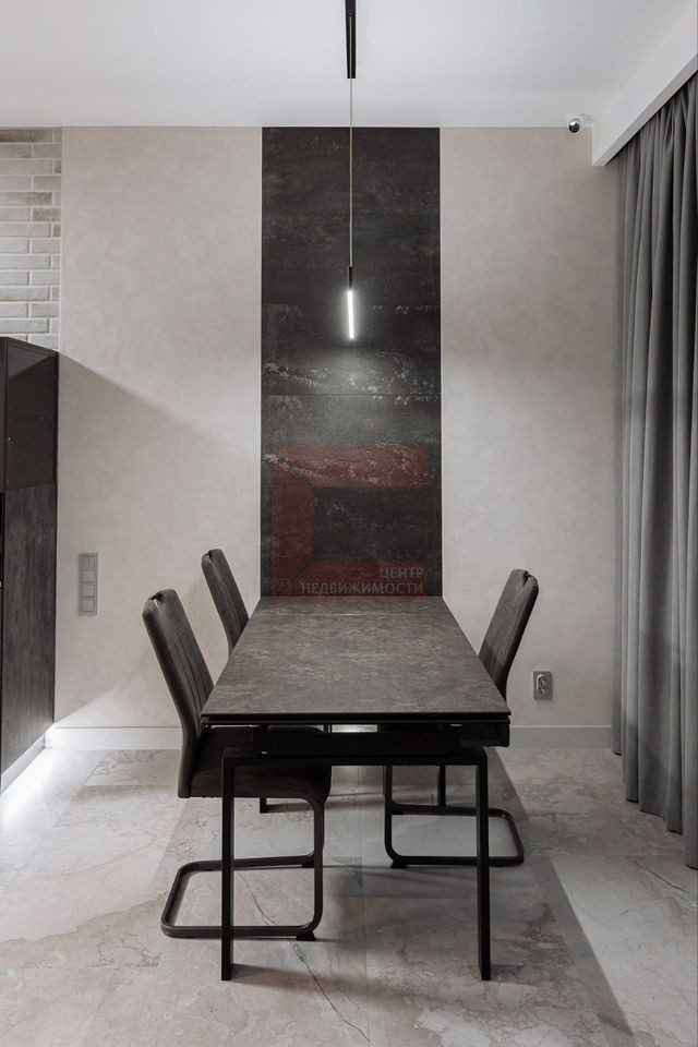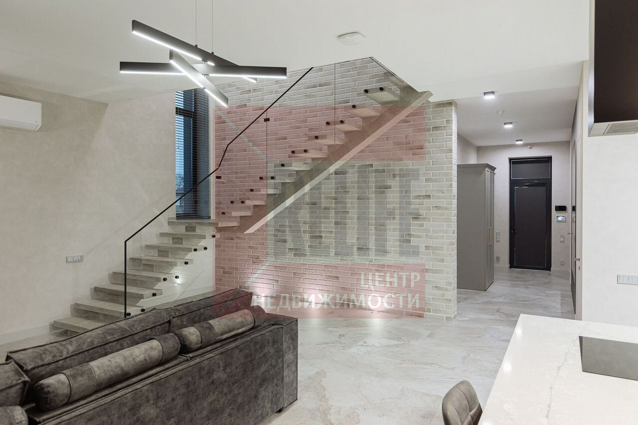 Интерьер выполнен с присущим минимализмом, обилием свободного пространства и присутствием промышленных элементов, в светло сером и антрацитовом цвете с изящным переходом в пастельные тона. Мебель подобрана в стиле неоклассики.