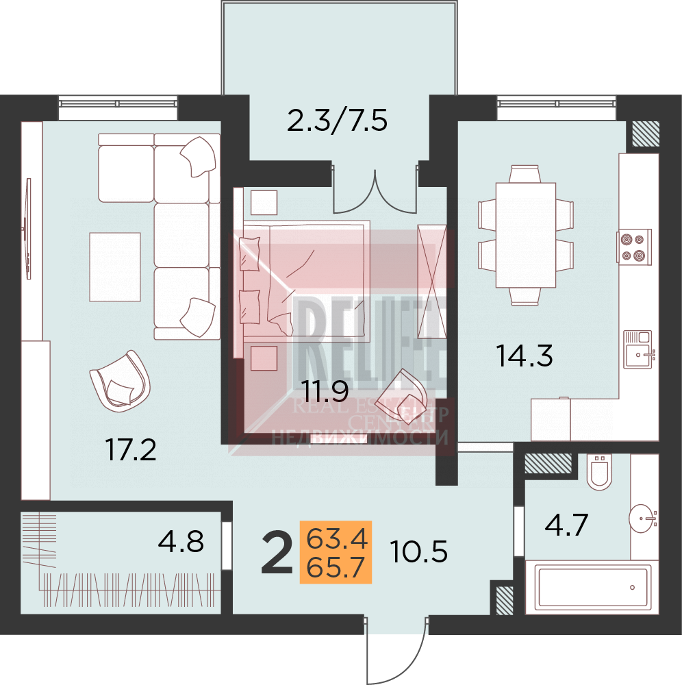 Общая площадь квартиры 65.7 кв.м, гостиная 17.2 кв.м, спальня 11.9 кв.м с выходом на балкон с витражной системой остекления «Авангард», кухня-столовая 14.3 кв.м, совмещенный санузел, холл 10.5 кв.м, гардеробная.
