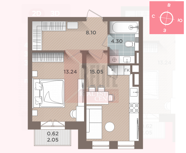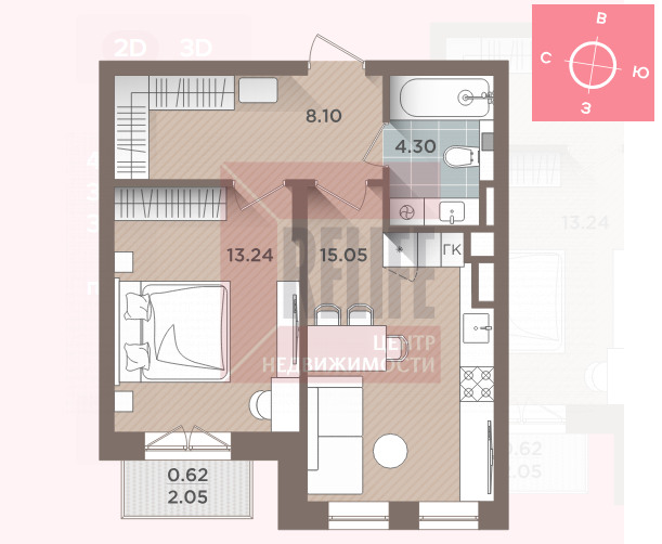 Общая площадь квартиры 41.31 кв.м, комната 13.25 кв.м с выходом на балкон, просторная кухня-столовая 15.05 кв.м, холл 8.1 кв.м с предусмотренной гардеробной и совмещенный санузел. Окна квартиры выходят на запад и открывают вид на живописный сквер.